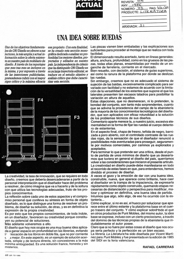 Nos reunimos en la Escola d’Art i Superior de Disseny de València (EASD) con Antonio Sánchez – subdirector del centro – y Xavier Giner, profesor en el mismo. Ambos son los responsables de que el trabajo acumulado en la mítica empresa de muebles bajo la gerencia de Vicent Martínez sea la base del Archivo Valenciano del Diseño. Que no del Archivo del Diseño Valenciano. Ese matiz nos lo explican más adelante. Igual que la importancia de conservar la documentación que genera el diseño.